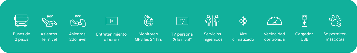 Nuestros buses están equipados con la más moderna tecnología, cuentan con dos niveles, asientos ergonómicos con 160° de inclinación en el primer